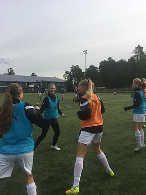Frida, startar som vänsterback, byter upp till vänstermittfält. Van att styra från MVposition. Får ta många och långa löpningar.